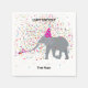 A cute illustration of an elephant partying and having fun! Elephant wearing a party hat and blowing party horn with confetti raining down on it. Let the celebrations begin! Perfect for anyone who loves funny animal illustrations. Ideal birthday party napkins. Customize the occasion and name and make it your own.