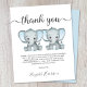 Cute budget-friendly thank you card for your twin baby boys shower with "thank you" in a stylish soft grey script with swashes and blue watercolors of two baby elephants. Easily personalize your thank you message in simple grey topography or leave blank for a handwritten note.