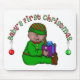 An African American baby dressed in a green suit and a striped stocking cap on customizable T-shirts, tote bags, and other holiday items. Candy cane striped text reads "Baby's First Christmas"!