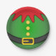 One of Santa's elves in their holiday green jumpsuit with a red jester-like collar. The jumpsuit is adorned with gold buttons and a leather belt with a gold buckle.