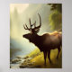Majestic elk drinking at a forest stream - a digital painting created using AI generating software.