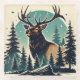 Stylized depiction of an elk with antlers amidst pine trees under starry backdrop, exuding wilderness charm.
