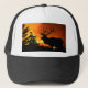 An elk stands on a hilltop as a wildfire rages behind him. His silhouette stands out sharply against the fire in the background. Computer art by Kathie Miller.