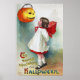 A charming vintage Halloween poster featuring a jung girl looking up to a Jack O'Lantern, painted by the American illustrator/commercial artist Ellen Hattie Clapsaddle.