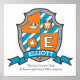 Knights style shield monogram E art name poster perfect for a boys bedroom or playroom in shades of orange, blue, white and gray. Personalize with your child's own name and name meaning for a truly personalized touch to your child's bedroom or nursery, this example is for the name Elliott The Lord is my God. A brave spiritual Celtic warrior. Poster print ideal for a gift to a new baby boy, for a christening, baby naming or baby shower gift. Unique shield drawing, graphic art and design by Sarah Trett. www.sarahtrett.com for www.mylittleeden.com