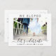 Elopement or private wedding announcement postcard to let family and friends that you eloped or reduced the number of guests at your wedding to a small intimate group, and to invite them to a wedding reception or celebration party. The front features your photo and "We Eloped Let's Celebrate" in a mix of simple typography and trendy script with swashes, and your first names and wedding date. On the reverse, personalize your announcement and invitation in more detail and add your names in a signature-like script.