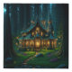 Faux canvas of a peaceful Tolkienesque Elven castle in a serene forest by a pond at dusk. Fairy lights illuminate the surroundings. Image was made with Leonardo.ai.