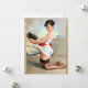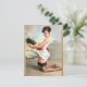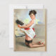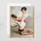 Elvgren Pin Up Girl Art. A woman dressed in a white apron and red heels is kneeling in a kitchen, holding a tray of burnt food with smoke rising. Her expression suggests surprise as she looks over her shoulder.