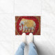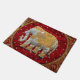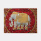 Image of an Indian Elephant decorated with sequins and beads in white, silver, and gold against maroon red velvet.
