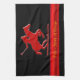 Sports series: A great design if you love polo! Polo is the Sport of Kings and this kitchen / tea towel will suit, too! It features an embossed-look galloping polo pony with rider about to strike the ball with the mallet. On a black background with a red brushed metal-effect stripe, change the text as desired or blank out.