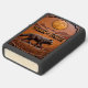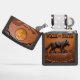 This Zippo lighter features a dramatic, highly dimensional, embossed-style illustration of a wolf walking along a path or clearing through textured tall grass. The scene is set under a large, burnished full moon and a stylized orange-brown sky above rolling mountains. The embossed text "WALK BY FAITH" is displayed prominently in the upper center. The entire design utilizes deep, earthy tones of brown and orange. The detailed texture and coloring give the entire design a Soft-Leather Look. You could easily mistake the textures for genuine leather. The design may look real due to the high detail in the artwork. The entire design is set on a matte black lighter casing.