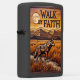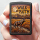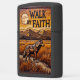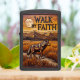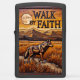 This Zippo lighter features a dramatic, highly dimensional, embossed-style illustration of a wolf walking along a path. The path cuts through dense, textured tall grass and brush, rendered in earthy brown and orange tones. The scene is set under a large, burnished full moon and a stylized orange-brown sky above rolling desert mountains. The embossed text "WALK BY FAITH" is displayed prominently in the upper center. The detailed texture and coloring give the entire design a Soft-Leather Look. You could easily mistake the textures for genuine leather. The design may look real due to the high detail in the artwork. The entire design is set on a matte black lighter casing.