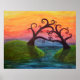 Fine art poster print of an original acrylic painting showing two stylized trees embracing each other over a body of water in front of a rainbow-colored sky. This print is also available on premium stretched canvas in my store.