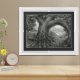 A detailed charcoal drawing by Amanda Diehl features a large, old tree growing bent over the edge of a cliff in the foreground. The tree's trunk and roots are prominently displayed, with intricate textures and patterns. Through a natural arch formed by the tree's branches, a landscape with hills, vegetation, and a cloudy sky is visible. Several birds are flying in the distance.