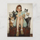 A delightful and humorous take on the “crazy cat lady” trope, this vintage-style portrait features a cheerful young woman sitting on a vintage trunk, surrounded by an adorable assortment of cats. Dressed in a retro floral dress and sturdy boots, her playful smile and the quirky cat companions bring charm and humor to the scene, celebrating the joy of feline obsession.