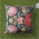 Richly embroidered flowers on black background with bright red cushion back to bring out the bright red in the embroidery.