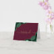 This elegant, modern wedding table reserved seating place card features an emerald green watercolor agate image trimmed with gold faux glitter in opposite corners. The word "reserved" appears in gold-colored handwriting script with swashes before and after on a burgundy red background on both sides of the card.