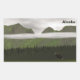 A digital painting of green conifer trees and mountains in Alaska on a very gray and cloudy day. A bull moose in the foreground lends scale to the scene. Text reading "Alaska" also appears.