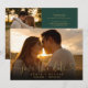 This elegant gold heart script photo save the date card features your photo and a script save the date above your names, date and venue. The reverse features an additional photo, message, and wedding website QR code on an emerald green background. Designed by Thisisnotme©