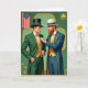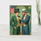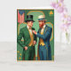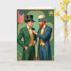 This design shows two well-dressed gentlemen standing close at center stage, one in an emerald green suit with a black top hat and the other in a teal long coat edged with gold and a cream top hat. The man in teal leans in to straighten the other’s bow tie, and their steady eye contact suggests an easy friendship with a hint of romance 💚. Warm light falls across their waistcoats and lapels, picking up deep greens and rich gold tones throughout the scene. Behind them, gold-lined panels frame the setting with repeating shamrock accents, adding a festive St. Patrick’s Day touch ☘️. An American flag appears in the background, tucked into the design like a quiet nod to shared heritage. Any greeting text sits near the top in gold lettering, balanced by smaller matching words near the bottom. The borders and panels are trimmed in thin gold lines, with shamrock shapes sprinkled around the edges.