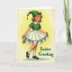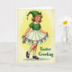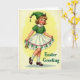 This card features a young girl centered against a softly glowing, sunlit yellow background, meeting your eyes with a gentle smile and rosy cheeks that suggest friendly warmth 🌷. She wears a green tunic with a white collar, and her lifted white pleated skirt opens like flower petals, as if she’s mid-curtsy for someone she likes. A thin magenta ribbon trims the skirt’s edge, dotted with small round green ornaments that look like they could sway with her movement. In her left hand, a small golden bell hangs from the ribbon, adding a sweet, almost secretive touch to her pose 🐇. On her head sits a pointed green cap with tiny red berry-like dots and a dangling green bead, giving her a springtime, storybook look without naming any character. Near the lower portion of the design, the words “Easter Greeting” appear in a modest, easy-to-read style, set in a darker tone that stands out against the warm background. White ribbed socks and brown strap shoes finish the outfit, while the skirt hem shows fine detailing with the magenta edging and green baubles clearly visible.