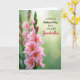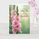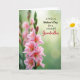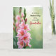 Designed with a tall row of flowering stems, the card centers on a slender stalk along the left side, topped with soft pink blossoms that fade from coral near the base to pale edges. Small green buds climb upward above the open flowers, like a gentle promise of more blooms to come, and the white stamens add fine, airy texture. The background falls away into a softly blurred garden of leafy greens with hints of warm gold, giving the flowers a calm, sunlit glow ❤️. In the upper right area, the message reads, “A Wish on Mother’s Day for a wonderful Grandmother,” set neatly so it balances the tall stem on the opposite side. Most of the text appears in a darker, easy-to-read tone, while the word “Grandmother” stands out in deep red with flowing letterforms that echo the richer pinks in the petals 🌼. The open blossoms lean slightly toward the wording, creating a tender, close-at-heart feel between the flowers and the message. Behind everything, the green-and-gold blur stays soft and light, with the brightest glow sitting just to the right of the tallest buds.