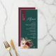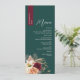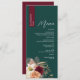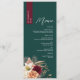 Add rich autumn elegance to your wedding tablescape with this personalized jewel-tone wedding menu. Featuring a deep emerald green background and a dramatic burgundy name strip, this rustic floral design showcases romantic blush, ivory, and wine-colored blooms with dried grasses—perfect for fall or winter celebrations. Elegant fonts and a clean layout give it a timeless yet modern feel. Customize the meal details and guest name for a beautiful place card alternative at your reception.