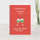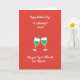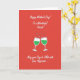 This greeting card features a rich crimson background that immediately feels like a cozy evening toast shared between close friends or sweethearts ❤️. Near the top, white flowing lettering stretches across the space, and matching white text sits along the bottom to balance the layout. In the center, two simplified stemmed glasses angle toward each other, their rims meeting in a gentle clink that suggests an affectionate, “we’re in this together” moment. Each glass is outlined in white and filled with emerald-green bubbly drink, with small white dots floating inside like rising fizz. Above the point where the glasses touch, a burst of tiny white star shapes and sparkles shoots upward, adding a light celebratory lift 🌼. The strong contrast of red, green, and white keeps the scene focused and easy to read, while the close spacing of the glasses makes the toast feel intimate. The sparkles form a loose arc above the glasses, with the brightest points clustered right over the touching rims.