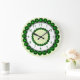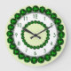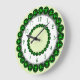 A beautifully elegant clock that features a print of not one but two circles of emeralds on a background of light green, white, and gray. Numbers are done in an elegant font and in a coordinating shade of dark green.