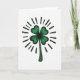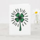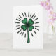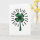This card features a large four-leaf clover centered on a bright white background, with four heart-shaped leaves that feel like they’re leaning toward each other in a quiet, affectionate huddle 💚. The clover is a rich emerald green, and each leaf is edged in a very dark forest green that sharpens the shape and makes it stand out. Short, radiating dash marks circle the clover like little sparks, giving the scene a celebratory St. Patrick’s Day lift ☘️. Inside the green areas, a lightly grainy texture adds a tactile, printed look, like ink settled into paper. The thick stem drops straight down from the middle, dotted with tiny speckles that keep the design feeling organic rather than flat. There’s no character scene or landscape, but the heart-like leaves and their close spacing suggest friendship or romance through their gentle symmetry. No text appears on the front, leaving the white space open around the clover while the dark outline and scattered rays frame the center. The final detail is the ring of short green lines around the clover, spaced evenly like a halo of tiny bursts.
