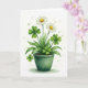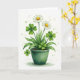 The front design shows a deep green ceramic pot centered on a bright white background, holding dark soil and a tall spray of leafy stems painted in layered greens 💚. Two white daisies open near the top, their petals soft and slightly uneven like fresh brushstrokes, circling warm golden centers that draw the eye. Tucked among the leaves are several four-leaf clovers in mixed shades of green, their heart-shaped lobes overlapping as if leaning close together ☘️. The stems rise in a gentle cluster that feels like a small bouquet meant to be admired side by side, with the flowers angled toward one another in a friendly, almost affectionate way. Light green paint splatters dot the open white space around the plant, adding a breezy springtime look without crowding the scene. Near the top, a short St. Patrick’s Day greeting sits in small green lettering, leaving plenty of white space to frame the arrangement. The pot has smooth shading along its curved rim and base, and the soft watercolor edges fade slightly into the white background. End with a friendly line about sharing St. Patrick's Day sentiments.