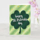 This card features a deep emerald four-leaf clover centered on the front, filling most of the space like a lucky emblem meant to be shared 💚. Across the clover, the words “happy St. Patrick’s day” sit in white cursive-style lettering, stretching neatly through the middle so it’s the first thing your eye lands on. Behind it, the background shifts from soft lime green to muted sage, creating a gentle gradient that feels light and inviting. Subtle diagonal stripes run through the backdrop, like a faint breeze moving across a spring field. Golden and pale-yellow five-point stars float around the clover at different sizes, scattered like confetti that two friends might toss into the air together ☘️. The mix of warm stars and cool greens gives the scene a cozy, affectionate energy, as if the clover is holding the message close. The stars are sprinkled across the green gradient, with a few clustered near the edges and others drifting near the center.