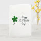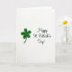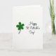 The front design shows a large four-leaf clover on the left, filled with emerald-green glitter that catches the light like tiny gems 💚. Each rounded leaf curves softly toward the others, giving the clover a close, cozy togetherness, with a slim, darker green stem anchoring it below. On the right side, the words “Happy St. Patrick’s Day!” appear in a flowing handwritten look, set in a dark charcoal color that feels warm and friendly beside the sparkling green. The text sits roughly centered vertically, leaving comfortable white space above and below so the message doesn’t crowd the clover. A bright white background keeps everything airy, like a quiet moment shared between friends across a table. Soft, even lighting makes the glitter twinkle without harsh shadows, so the clover looks gentle rather than loud ☘️. The sparkle is densest toward the middle of each leaf, with finer flecks fading toward the edges against the smooth white field. End with a friendly line about sharing St. Patrick's Day sentiments.