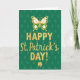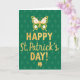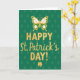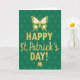Designed with a rich emerald green background, this St. Patrick’s Day card features a subtle repeating diamond pattern in a slightly darker green that adds depth behind the main greeting. Centered on the front, “HAPPY St. Patrick’s DAY!” appears in textured golden yellow, with “HAPPY” in large uppercase letters and the rest in a flowing cursive style that feels like a warm note shared between close friends 💚. Above the words, a stylized butterfly hovers as if it’s just drifted in to witness the celebration, its wings filled with crisp white and spring green shapes and edged in the same gold. The butterfly’s light, airy placement adds a gentle, almost affectionate pause above the message, like a quiet smile before a toast. Along the bottom edge, a classic three-leaf shamrock anchors the layout in matching gold, giving the design a grounded, lucky focal point ☘️. The gold elements carry a slightly worn texture that makes the lettering and icons look softly weathered rather than glossy. Share St. Patrick’s Day sentiments with someone you care about.