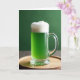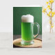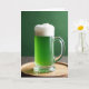This card shows a clear glass mug centered in the scene, filled with rich emerald-green beer that glows against a deep forest-green background 💚. A thick, cloudlike cap of white foam rises above the rim, giving the drink a cozy, inviting look, like it’s waiting to be shared with a close friend ☘️. The mug’s curved handle catches soft, diffused light, and the fluted base refracts it in gentle highlights. Beneath the glass sits a warm wooden tray with light texture, adding a grounded, homey touch to the setting. The greeting “Happy St. Patrick’s Day” appears near the top in small white lettering, balanced and easy to read against the dark green backdrop. A shorter line of text sits along the bottom in pale green, tucked just above the tray without covering the mug. The final detail is the crisp contrast where the bright foam edge meets the smooth green surface inside the glass.