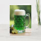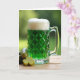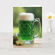 This card features a sturdy diamond-patterned glass mug filled with emerald-green drink, topped with a cloud of white foam that looks soft enough to share. Light catches on the faceted glass and scatters across the green liquid, like a quiet toast between close friends 💚. The mug sits on a warm, pale wooden surface that adds a cozy, at-home feel to the scene. To the left, a few glossy green pickles rest nearby, their shiny skins reflecting tiny highlights like they’ve been set out for someone you’re enjoying the day with. In the foreground, a lime wedge carved into a shamrock shape adds a sweet little nod to St. Patrick’s Day ☘️. The greeting text appears near the top in white, standing out against the soft green background, with a smaller line of text placed near the bottom in matching white. Behind everything, the background fades into a gentle green blur, while the shamrock lime and foamy mug stay sharp in the center.