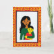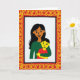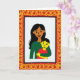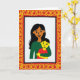 This design shows two figures in a close embrace, with a woman holding a smaller child against a bright white background, and their faces turned toward each other with an affectionate, easy smile ❤️. The woman has flowing dark hair, warm brown skin, and a deep emerald green outfit, while the child has yellow-toned skin, short dark hair, and a red top, leaning in as if enjoying the closeness. Their round eyes and relaxed cheeks add to the feeling of comfort, like a quiet moment of friendship within family. The artwork uses flat areas of color with minimal shading and tidy outlines, giving the scene a simple, graphic look. A thick red frame surrounds the pair, filled with looping golden-yellow decorative patterns that feel celebratory, like festival trim 🌼. Any wording sits within the border area rather than over the figures, set in a clear layout with yellow lettering against the red edge for strong contrast. The central image stays uncluttered, letting the embrace stand out while the ornate border adds energy around it. The outer border is crimson red, and the curling motifs inside it are bright golden yellow arranged in repeating loops.