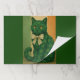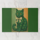 A poised emerald cat adorned with subtle clover motifs, its golden gaze calm, enigmatic, and quietly commanding, finished with a delicate bow crafted from vintage sheet music.