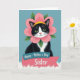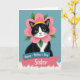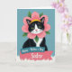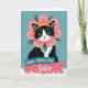 This card features a black-and-white tuxedo cat centered on a muted teal background, gazing forward with bright green eyes that feel like a gentle, friendly hello ❤️. Around the cat’s head sits a large pink flower like a soft collar, with layered petals that look lightly textured and springy. Small green leaves peek out from behind the blossom, adding a natural frame, and a sunny yellow band rests on top like a tiny accent. The cat’s white muzzle and chest contrast with its dark coat, giving the portrait a polished, cozy look that suggests closeness and care. Below the portrait, a two-tier ribbon banner is stacked neatly, as if it’s been tucked under the cat like a thoughtful note. The upper ribbon is teal with the words “Happy - Mother’s Day” in a lighter, easy-to-read style, and the lower ribbon is coral pink with “Sister” written larger for emphasis 🌼. The banner sits on a fluffy white patch that resembles soft fur, with the coral ribbon overlapping the teal ribbon slightly.