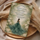 This elegant quinceañera design features a soft emerald green watercolor background framed by romantic ivory roses, delicate greenery, and subtle gold accents, with a graceful gown illustration creating a refined, enchanted garden atmosphere. The rich green palette combined with classic florals gives the design a luxurious yet youthful feel, perfect for a timeless quinceañera celebration with a romantic, nature-inspired aesthetic.