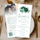Emerald Gold Florals Love Story Photo Wedding Menu Card. Available digitally and printed. A dual purpose design. Beautiful flowers are at the top, with an elegant script for Menu and easy to personalise the rest of the text to your requirements. On the back add your love story, photo and a QR code for guests to scan to upload their photos to you. Simply change the sample url to that of the website you wish the qr code to link to and your QR code will automatically be created.