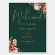 This elegant rustic floral wedding welcome sign can be personalized with your information in chic gold typography on an emerald green background. Designed by Thisisnotme©