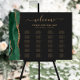The left-hand edge of this elegant modern wedding seating chart features an emerald green watercolor agate border trimmed with faux gold glitter. The word "welcome" appears at the top in elegant gold-colored handwriting script with swashes at the beginning and end. Customize with the names of the bride and groom and wedding date in italic font. Edit the four columns with a list of your guests' names and table numbers in gold-colored copperplate font on a slate black background. Accommodates up to 100 names.