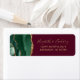 The left-hand edge of this elegant modern wedding invitation return address label features an emerald green watercolor agate border trimmed with faux gold glitter. The customizable text combines gold-colored handwriting script and copperplate fonts on a burgundy background.