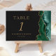 The right-hand edge of this elegant modern wedding table number card features an emerald green watercolor agate border trimmed with faux gold glitter. The customizable text combines gold-colored serif, italic and copperplate fonts on an off-black background.