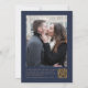 The left-hand edge of this elegant modern wedding invitation features an emerald green watercolor agate border trimmed with faux gold glitter. The customizable text combines gold-colored handwriting, copperplate and italic fonts on a navy blue background. Add your favorite photo to the reverse side, along with additional text and a QR code to send guests to your wedding website.
