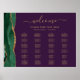 The left-hand edge of this elegant modern wedding seating chart features an emerald green watercolor agate border trimmed with faux gold glitter. The word "welcome" appears at the top in elegant gold-colored handwriting script with swashes at the beginning and end. Customize with the names of the bride and groom and wedding date in italic font. Edit the four columns with a list of your guests' names and table numbers in gold-colored copperplate font on a purple background. Accommodates up to 100 names.