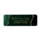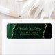 This elegant modern wedding invitation return address label features an emerald green watercolor agate background trimmed with faux gold glitter. The customizable text combines gold-colored handwriting script and copperplate fonts.