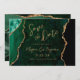 This elegant wedding save the date card features a background image of emerald green watercolor agate trimmed with faux gold glitter. The customizable text combines gold-colored modern handwriting, copperplate and italic fonts. The reverse side features a coordinating emerald green and gold agate design.