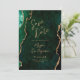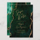 This elegant wedding save the date card features a background image of emerald green watercolor agate trimmed with faux gold glitter. The customizable text combines gold-colored modern handwriting, copperplate and italic fonts. The reverse side features a coordinating emerald green and gold agate design.